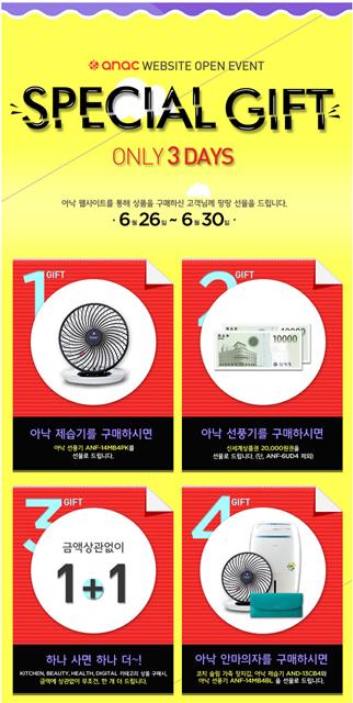 한편, 아낙은 30일까지 여름 인기 상품인 아낙선풍기 구입 시 신세계 20000원권을 추가로 증정하며, 사이트 오픈 축하메시지를 남기는 회원 총 50명에게 제습기, 선풍기, 스타벅스 음료쿠폰 등을 선물하는 이벤트를 진행한다.