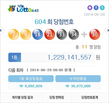 나눔로또는 28일 추첨된 제604회 로또 1등 당첨번호는 ‘2, 6, 18, 21, 33, 34’로 결정됐다. 2등 보너스 번호는 ‘30’이라고 밝혔다.