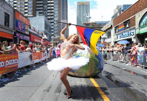 29일(현지시간) 캐나다 토론토에서 열린 ‘2014 월드 게이 퍼레이드’에서 한 여성 참가자가 포즈를 취하고 있다. 이번 행사 참가자는 약 100만 명에 이를 것으로 추정됐다.