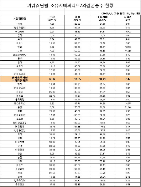 [표]기업집단별 소유지배괴리구도 및 의결권승수 현황