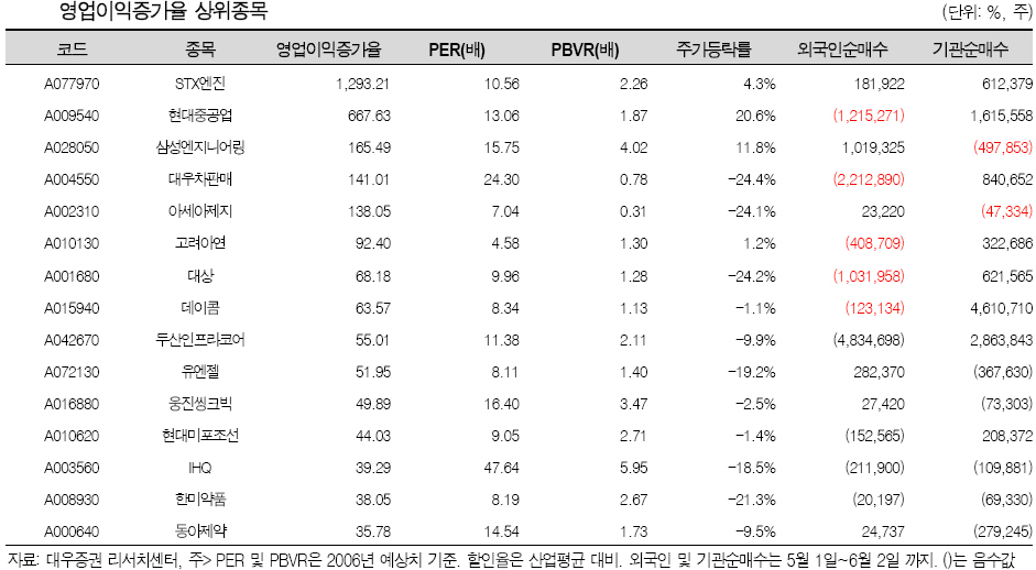 김평진 연구원은 "업황이 좋아질 것으로 예상되는 업종 내의 종목들이 실적에 대한 모멘텀도 보유하고 있으며 이로 인해 외국인 및 기관의 수급이 균형을 이루고 있고 주가가 안정 내지는 상승세를 보여도 밸류에이션 메리트가 희석되지 않는다는 공통적인 특징을 가지고 있다"고 분석했다.