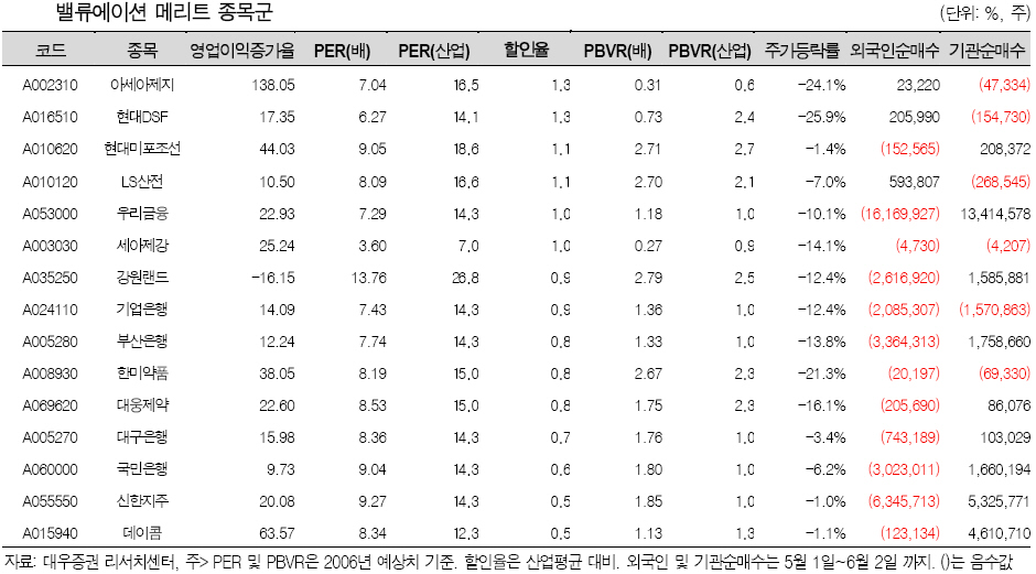 대우증권은 4일 이처럼 지수대비 상대수익률이 양호한 몇가지 종목들이 ▲실적개선 ▲밸류에이션 메리트 ▲수급의 균형 등에서 공통적인 특징을 가지고 있는 것으로 풀이했다.