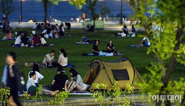 서울과 경기남부·서부, 강원영서남부 등 19개 시·군에 폭염주의보가 내려지고 열대야까지 이어진 10일 서울 여의도 한강공원을 찾은 시민들이 강바람에 더위를 식히고 있다. 최유진 기자 strongman55@