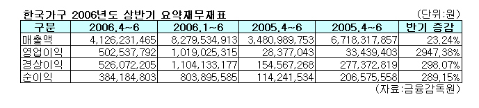 8일 한국가구는 2006사업연도 상반기(2006년 1월~6월) 정기보고서를 통해 올 상반기 매출이 83억원으로 지난해 같은 기간에 비해 23.24% 증가했다고 밝혔다.