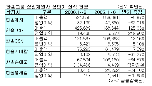 한솔그룹 6개 상장 계열사들의 올 상반기 실적이 한솔LCD을 제외하고는 영업이익이 감소하는 등 전반적으로 부진한 것으로 나타났다.