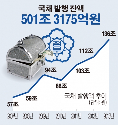 2010년 86조원으로 줄었으나 유럽 재정위기를 만나 다시 2011년 103조원, 2012년 112조원에 이어 지난해는 복지정책 재원 마련을 위해 136조원으로 커졌다.
