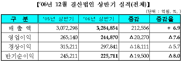 17일 증권선물거래소의 12월 결산법인 상장사 상반기 실적에 따르면 총매출액은 전년동기보다 6.9% 증가한 328조5000억원을 기록한 반면 같은기간 영업이익과 순이익은 각각 7.6%, 8.0% 감소한 24조5000억원, 22조6000억원으로 집계됐다.