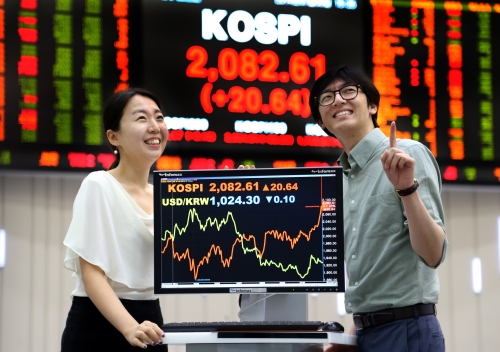 ▲코스피 지수는 30일 2082.61p로 마감하며 4거래일 연속 연중 최고치를 경신했다. (사진제공 한국거래소)