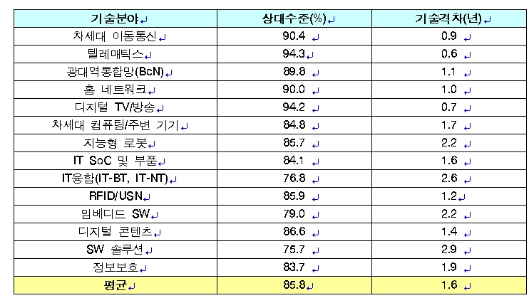 특히 IT 신성장동력 기술분야 중 차세대 이동통신, 디지털TV방송, 텔레매틱스 등은 세계최고 기술 선진국인 미국 대비 상대수준이 90% 이상이고, 기술격차가 1년 미만으로 조사됐다.