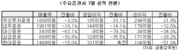 7월 실적을 공개한 국내 5대 증권사(우리, 대우, 대신, 현대, 삼성) 가운데 우리투자증권과 현대증권을 제외한 3곳이 모두 전월에 비해 영업이익이 줄어들었다.