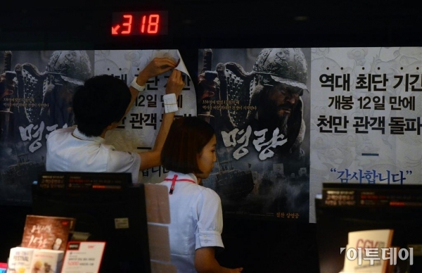 이순신 장군의 ‘명량대첩’을 바탕으로 한 영화 ‘명량’이 역대 최단기간 1000만 관객을 돌파했다. 영화 ‘명량’의 투자 배급사 CJ 엔터테인먼트는 10일 오전 개봉한 지 12일 만에 관객 1000만을 넘었다고 밝혔다. 10일 오전 용산의 한 영화관에서 직원들이 영화 ‘명량’의 1000만 관객 돌파를 알리는 포스터를 붙이고 있다. 노진환 기자 myfixer@