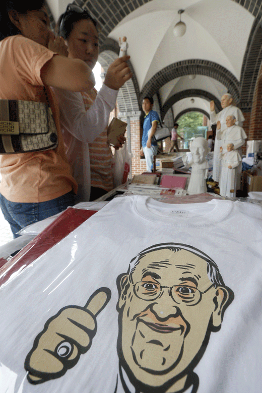 프란치스코 교황 방한을 앞두고 휴일인 10일 서울 명동성당에서 신도들이 관련 기념품을 구입하고 있다.