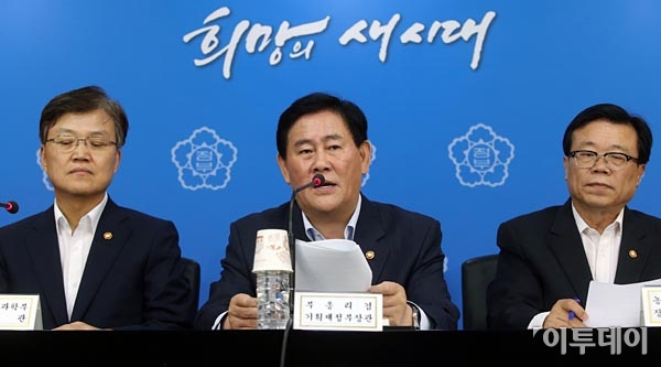 최경환 경제부총리 겸 기획재정부 장관(가운데)이 12일 오후 정부서울청사에서 무역투자진흥회의 합동브리핑에 참석, 투자활성화 대책을 발표하고 있다. 최유진 기자 strongman55@