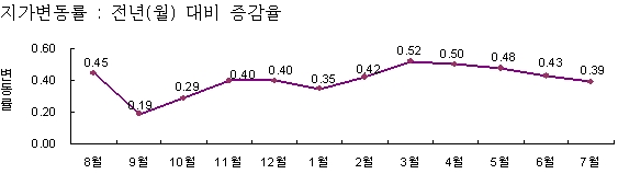 한편 7월 전국 지가상승률은 0.39%로 소폭 오르는데 머물렀다. 지역별로는 전국 248개 시군구 중 전국평균 상승률을 상회한 지역은 53개 지역이며 나머지 195개 지역은 평균이하의 상승률을 보여 일부 개발지역을 제외하고는 지가가 전반적으로는 안정세를 보이고 있는 것으로 분석된다
