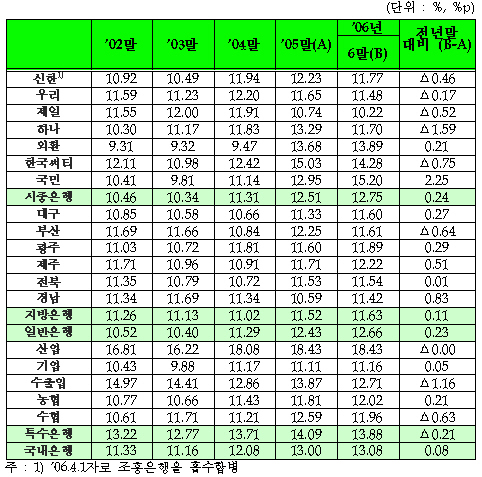은행별로는 국민, 외환, 대구, 광주, 제주, 전북, 경남, 기업, 농협 등 9개 은행이 전년말보다 상승한 반면 신한, 우리, 제일, 하나, 한국씨티, 부산, 산업, 수출입, 수협은 하락했다.