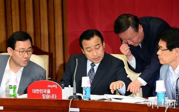 이완구 새누리당 원내대표와 김재원 원내수석대표가 19일 오전 여의도 국회에서 열린 원내대책회의에 참석해 이야기를 나누고 있다. 노진환 기자 myfixer@
