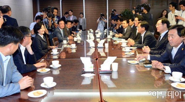 박영선 새정치민주연합 원내대표와 중요당직의원들이 19일 오전 여의도 국회 의원회관에서 열린 원내대표단 및 중요당직의원 간담회에 참석해 이야기를 나누고 있다. 노진환 기자 myfixer@