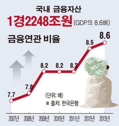 20일 한국거래소와 한국은행에 따르면 지난해 총 금융자산은 1경2248조원, 국내총생산(GDP)은 1428조원으로 금융연관비율이 8.6배를 기록했다.