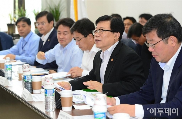 이동필 농림축산식품부 장관(오른쪽 두 번째)이 20일 오전 여의도 국회 새누리당 정책위의장실에서 열린 당정협의에 참석해 모두발언을 하고 있다. 노진환 기자 myfixer@