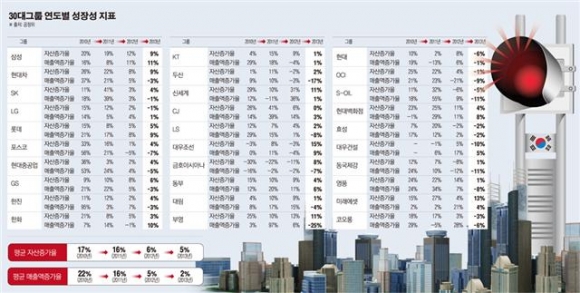 재계 한 관계자는 “보유 중인 현금성 자산을 외형적인 성장을 위해 투자하지 않고 불경기 등에 따른 재무적인 내실화를 위해 부채 상환 등에 주력했던 경향도 총자산증가율을 둔화시키는 요인으로 작용한 것으로 보인다”고 말했다.