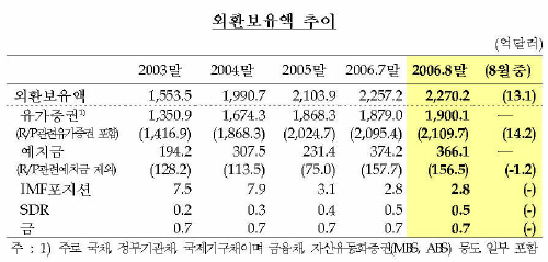 한국은행은 8월말 현재 우리나라 외환보유액이 2270억2000만 달러로 전월말(2277억2000만달러)에 비해 13억1000만 달러 증가했다고 4일 밝혔다.