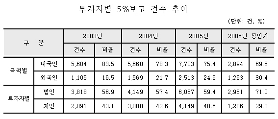 특히 외국인의 5%지분보고 비중은 지난 2003년(16.5%) 2004년(21.7%) 2005년(24.6%) 등 해마다 꾸준히 증가하며, 내국인 비중을 잠식하고 있는 것으로 나타났다.
