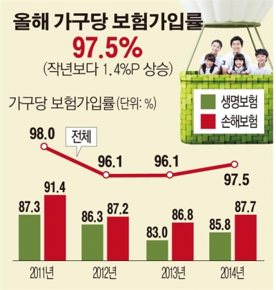 올해 가구당 보험가입률은 97.5%로 지난해보다 1.4%포인트 상승한 것으로 나타났다.