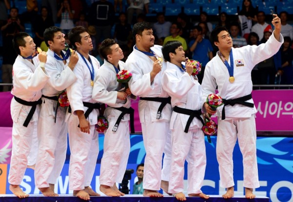 23일 인천 도원체육관에서 열린 2014 인천아시안게임 유도 남자 단체전 결승전 경기에서 승리한 한국 선수들이 금메달을 목에 걸고 셀카를 찍고 있다.