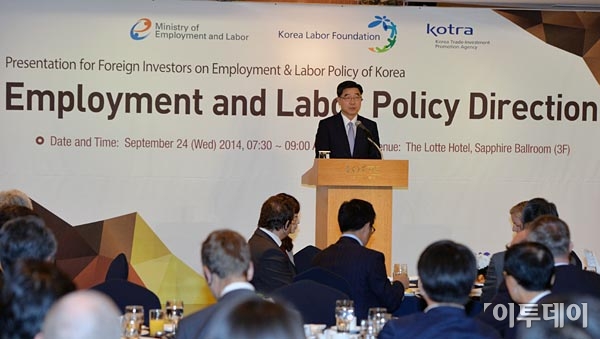 이기권 고용노동부 장관이 24일 오전 서울 중구 롯데호텔에서 외국인투자기업 최고경영자(CEO)와 인사노무관리 임원 등이 참석한 가운데 열린 고용노동정책 설명회에 참석해 기조연설을 하고 있다. 최유진 기자 strongman55@