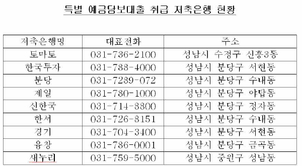 금융감독원은 17일 경기 성남ㆍ분당 지역에 소재한 토마토저축은행 등 9개 상호저축은행이 좋은저축은행의 영업정지로 예금인출을 하지 못하는 예금자들을 위해 20일부터 특별 예금담보대출을 취급할 예정이라고 밝혔다.
