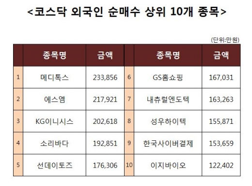 2일 코스닥 외국인 순매수 상위 10개 종목