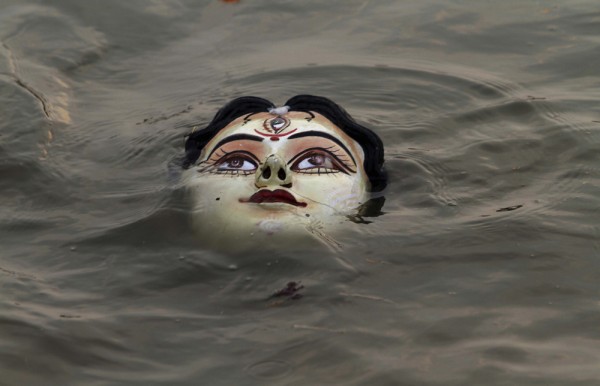 5일(현지시간) 인도 부바네스와르에서 힌두여신 두르가 푸자 축제가 열린 가운데 쿠아카이강에 두르가 여신의 우상이 떠 있다. 두르가 푸자 축제는 힌두교도에게 가장 큰 중교 행사 중 하나로 힌두교도들은 두르가 여신이 권력과 선의 승리를 상징한다고 믿는다.