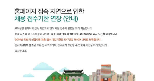 이어서 교보생명 측은 “현재 시스템 복구조치 중에 있으며, 최종 점검 완료 후 6일 오후 11시부터 다시 오픈할 예정이다. 2014 하반기 신입사원 채용 접수 마감기한은 7일 오후 6시까지로 연장한다”고 공지했다.
