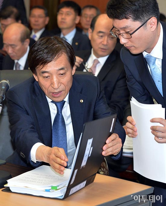이주열 한국은행 총재가 7일 오전 서울 중구 한국은행 본관에서 열린 국회 기획재정위원회의 한국은행 국정감사에 참석해 자료를 확인하고 있다. 최유진 기자 strongman55@