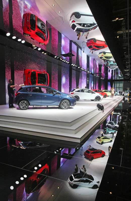 '2014 파리 모터쇼'가 지난 4일 프랑스에서 개막했다. 사진은 파리 모터쇼에 출품된 신차들이 천장과 바닥에 비쳐 화려한 광경을 연출하고 있는 모습.